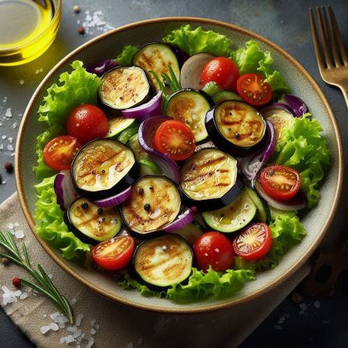 구운 가지와 토마토, 양상추를 그릇에 담습니다.