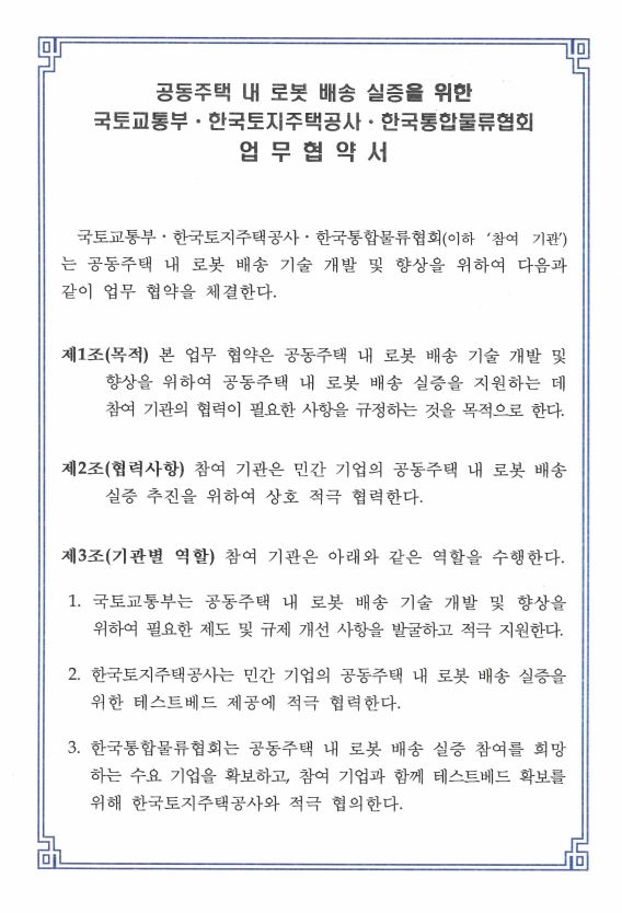 ● 이에, 국토부, LH, 한국통합물류협회는 공동주택 내 로봇배송 실증 지원을 위한 업무협약(MOU)을 체결(4.23)한 바 있으며, 이후 후속 논의를 거쳐 구체적인 실증 지원방안을 마련하게 되었습니다.